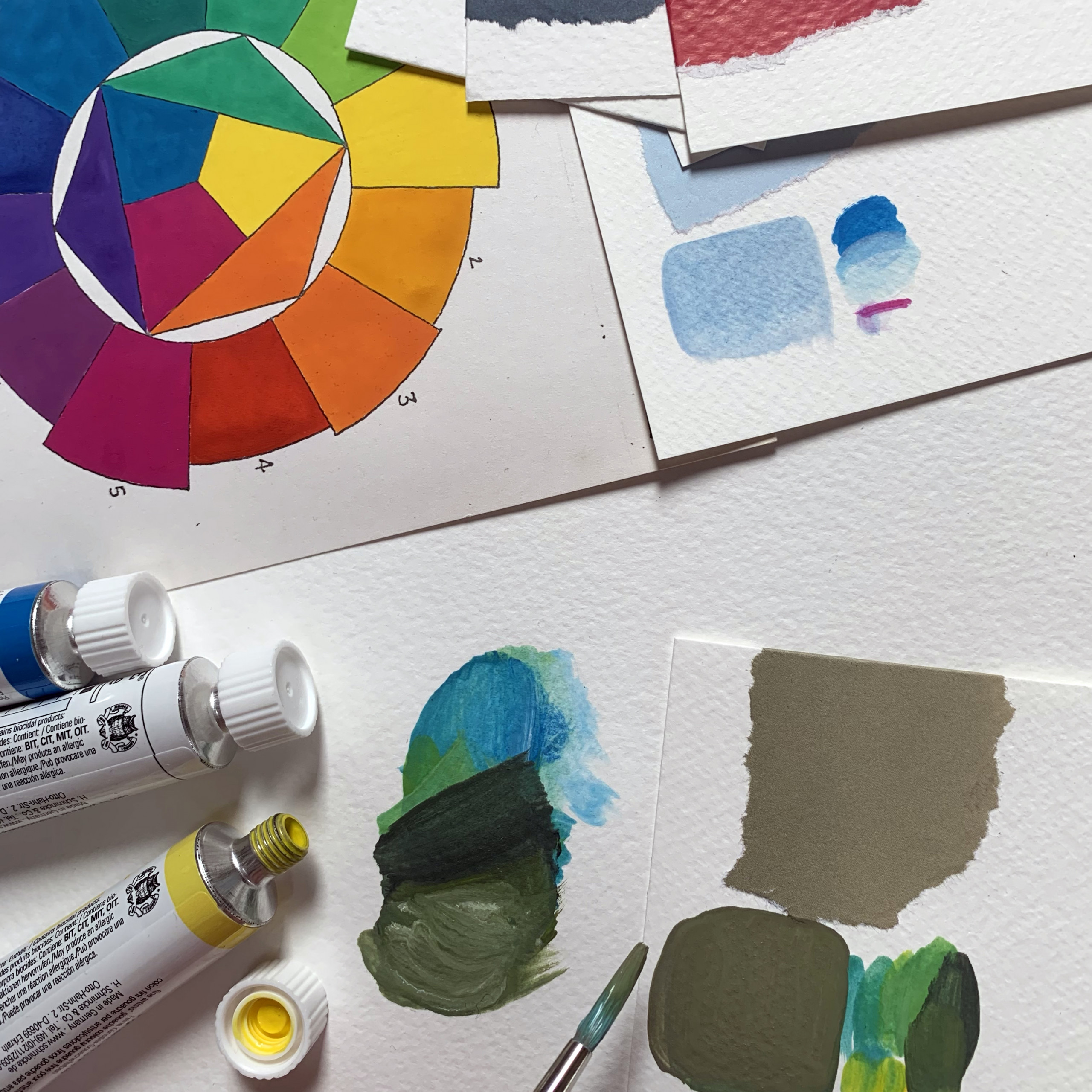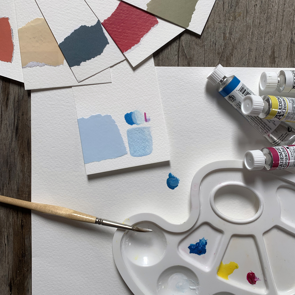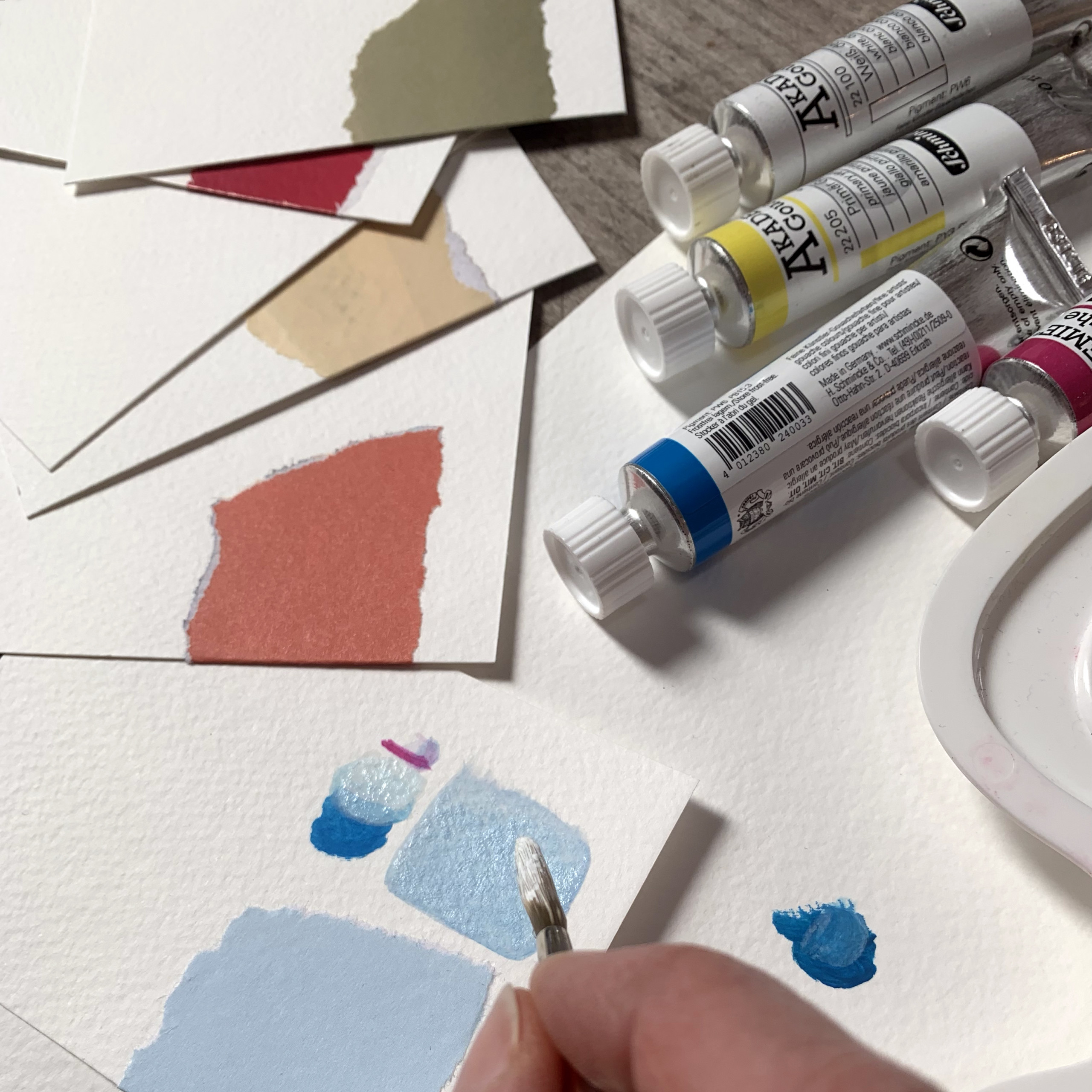 + falls vorhanden: eigenen Gouache- oder Wasserfarben (cyan, magenta, yellow, schwarz und weiß)