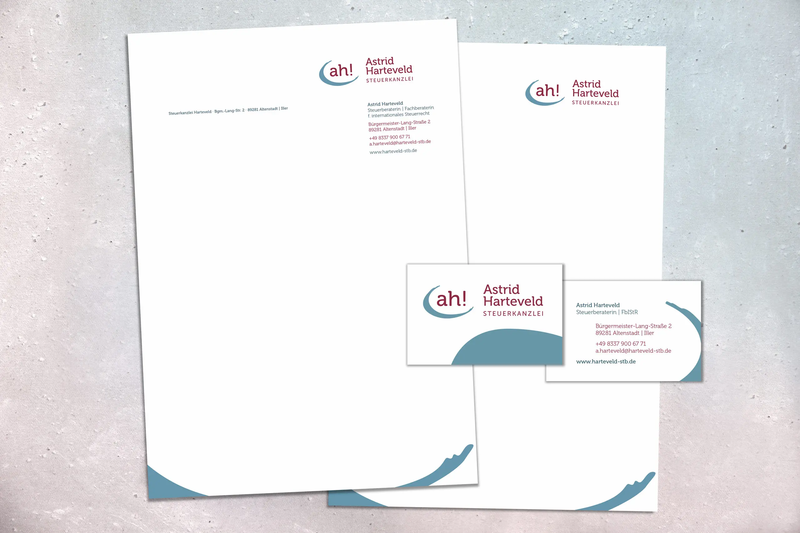 In enger Zusammenarbeit mit Astrid Harteveld entwickelte ich das Erscheinungsbild und Logo für ihre neugegründete Steuerkanzlei. Hierbei war es wichtig einerseits Seriosität und Kompetenz, andererseits ein frisches Image mit persönlicher Note darzustellen.